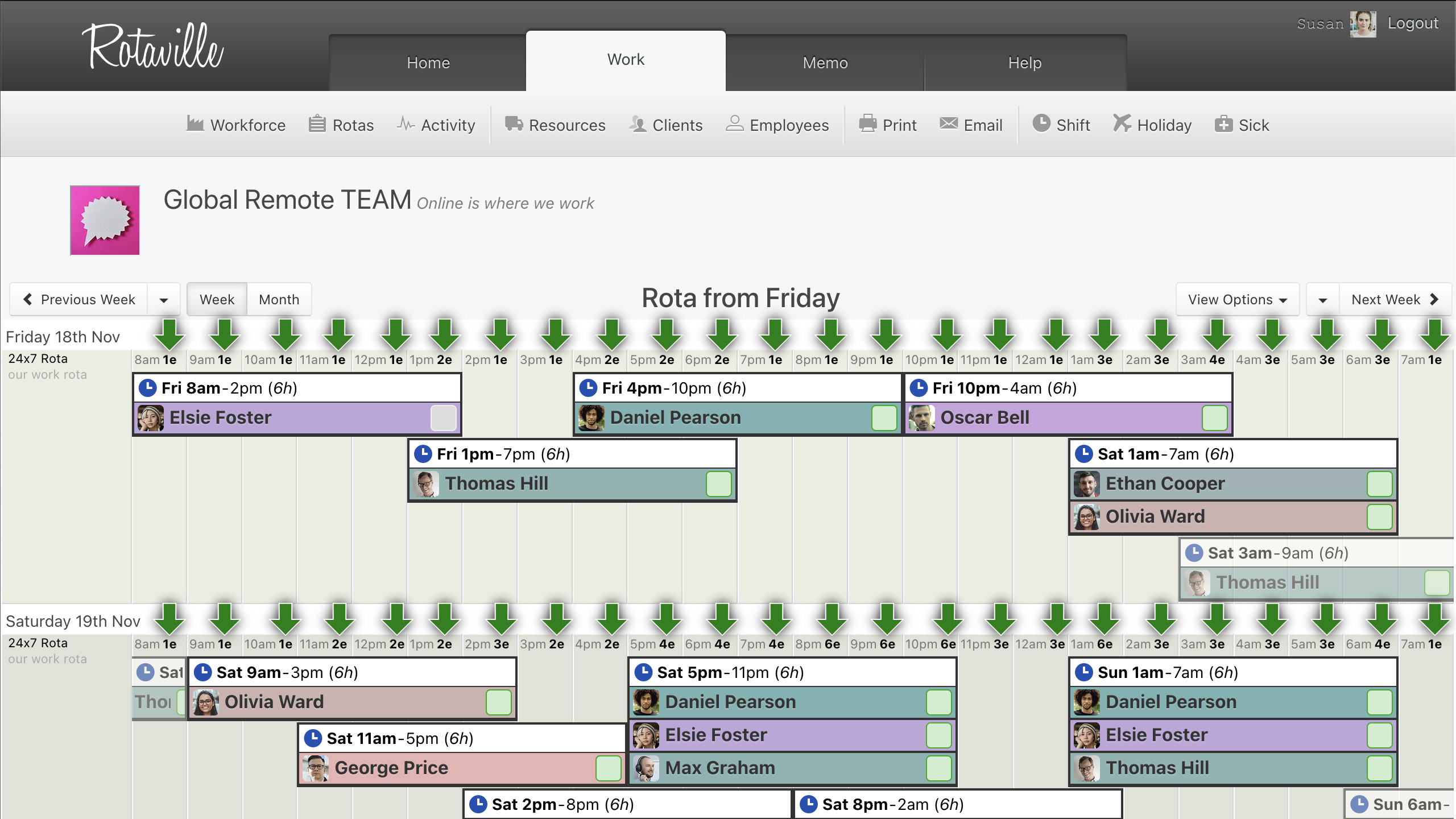 24/7 schedule support: Whether you need a call centre schedule, social media help desk schedule, or follow-the-sun global tech support schedule, Rotaville has you covered with customizable 24/7 scheduling options.